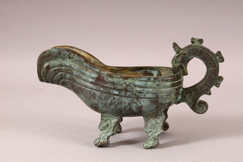 A CHINESE ARCHAIC STYLE TWIN HANDLE LIBATION CUP - with archaic style decoration - 11cm x 22cm