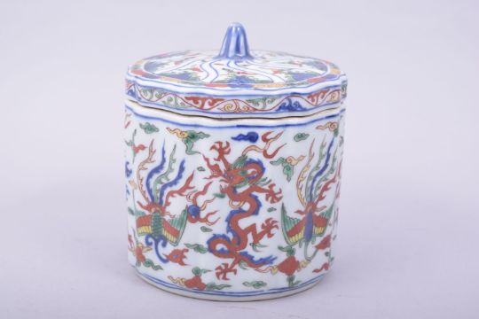A CHINESE WUCAI PORCELAIN RIBBED CYLINDRICAL BOX AND COVER, the exterior painted with dragon and phoenix, the base with six character mark, 15.5cm high overall.