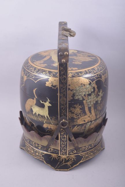 AN EARLY 20TH CENTURY LACQUERED WOOD JUBAKO / FOOD CARRIER, in black and gilt lacquer and decorated with panels of native flora and fourna, the barrel formed box in three opening sections and supported on a circular base with a large bar handle with metal mounts, 47cm high overall.