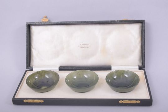 A FINE SET OF THREE CHINESE JADE CUPS, in fitted box, each 7cm diameter.
