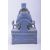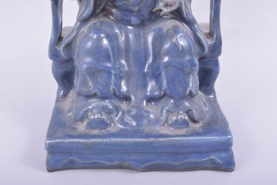A LARGE CHINESE POWDER BLUE GLAZE POTTERY SEATED FIGURE of a god, the figure seated upon a throne holding a ruyi scepter, the face and heads unglazed, 37.5cm high.