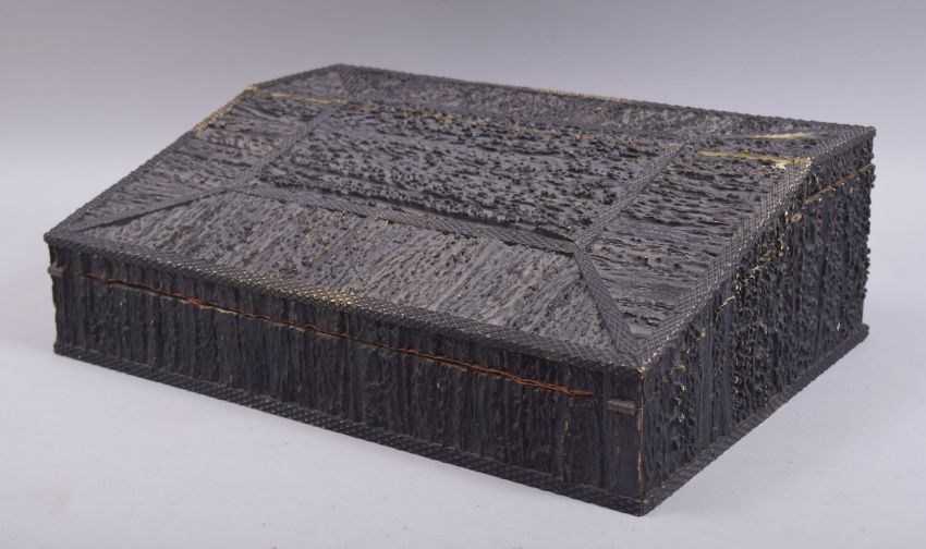 A LARGE INDIAN STAGHORN VENEERED WRITING SLOPE, the interior with sandalwood compartments and ivory, the slope with a band of penwork on ivory surrounding a velvet panel, the hinged lid open; 47cm x 38.5cm.