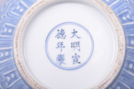 A CHINESE MING STYLE BLUE GLAZED PORCELAIN BOWL, the exterior decorated with dragons amongst stylised clouds, the base with six character mark, 21cm diameter.