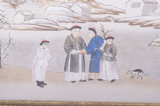 A LARGE CHINESE FRAMED GOUACHE PAINTING, depicting four figures with a dog in a landscape scene, framed and glazed in a pierced and gilded frame, 49cm x 78.5cm overall.