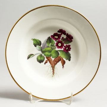 A 19TH CENTURY SPODE PLATE painted with a botanical specimen of a Mountain Primula, titled in red verson.