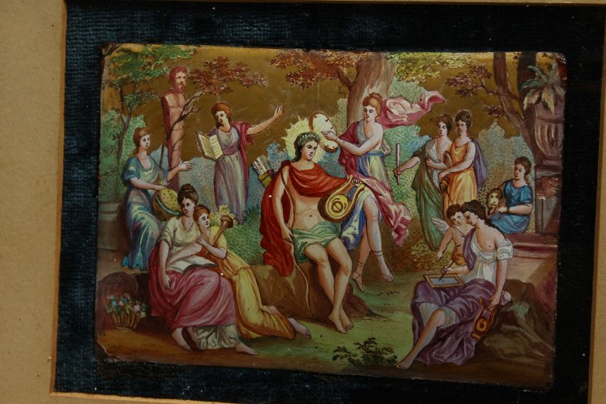 A 19TH CENTURY FRAMED CLASSICAL ENAMEL PLAQUE, Diana with her attendants.