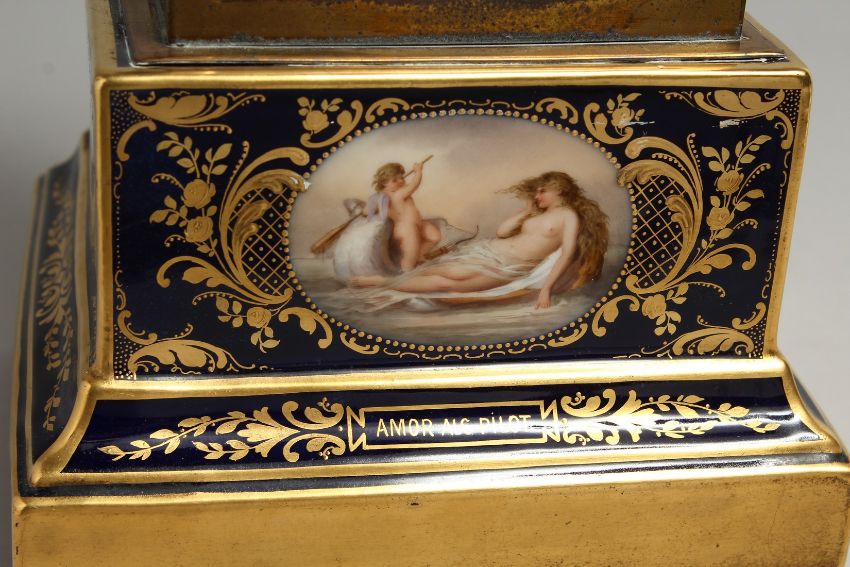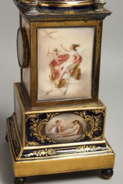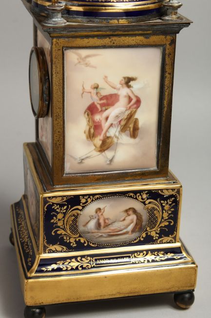 A VERY GOOD 19TH CENTURY VIENNA PORCELAIN CLOCK with metal supports and painted panels with cupids and classical scenes.