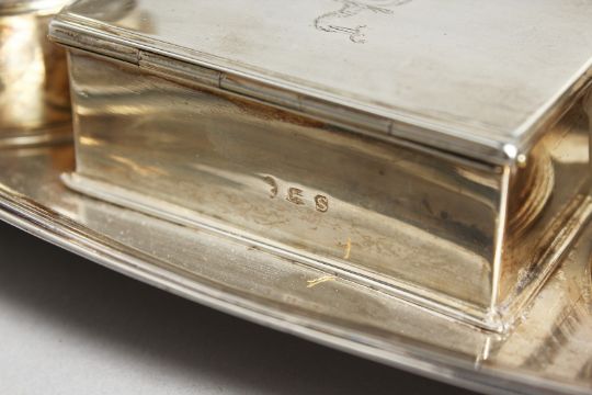 A GEORGE III BOAT SHAPED TWO BOTTLE INKSTAND, the centre with a box with rising lid.