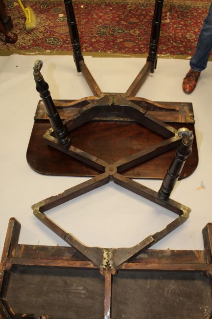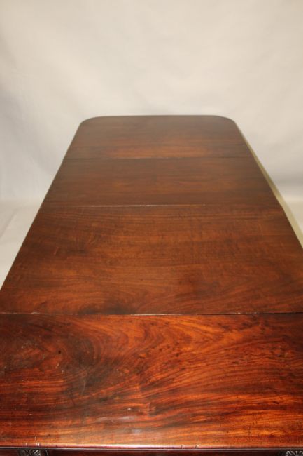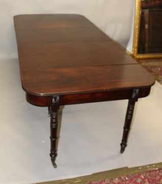 AN EARLY 19TH CENTURY MAHOGANY EXTENDING DINING TABLE, with patinated ratchet and hinged mechanism, the rounded rectangular top with two extra leaves, supported on six turned legs on brass castors.