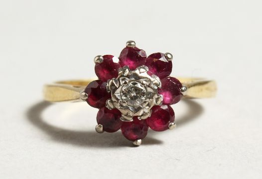 AN 18CT GOLD RUBY AND DIAMOND CLUSTER RING.