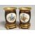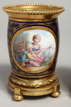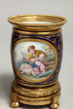 A VERY GOOD PAIR OF SMALL SEVRES VASES with ormolu panels, the porcelain edged in gilt and painted with reverse panels of figures and trophies.