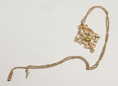 AN EDWARDIAN GOLD PENDANT AND CHAIN.