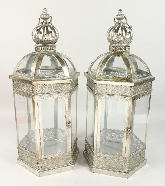 A PAIR OF HEXAGONAL SILVERED METAL LANTERNS