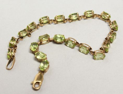 A GOLD AND PERIDOT LINE BRACELET.