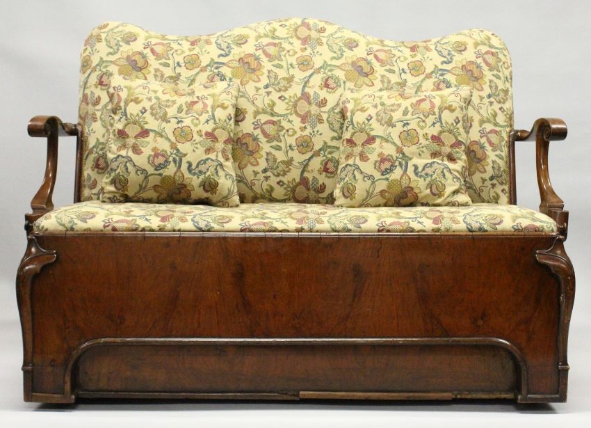 A LONG GEORGIAN MAHOGANY SETTEE with show wood arms and padded back and seat.