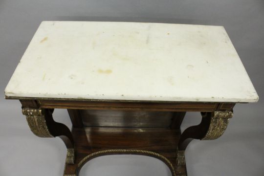 A REGENCY ROSEWOOD AND PARCEL GILDED CONSOLE TABLE, with a rectangular white marble top over a frieze drawer, cared scrolling supports, the mirror back supported on a platform base.