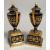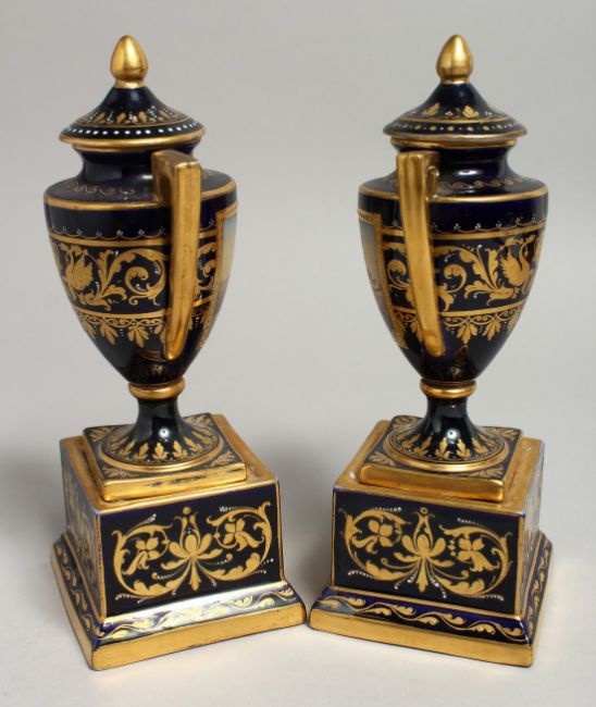 A SUPERB SMALL PAIR OF VIENNA URNS, COVERS AND STANDS rich gilt decoration and painted classical scenes.