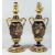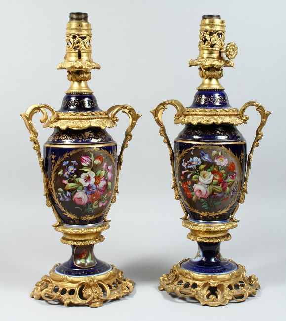 A PAIR OF PARIS PORCELAIN AND ORMOLU MOUNTED URN SHAPED TABLE LAMPS, painted with panels of flowers to both sides, having openwork handles and bases.