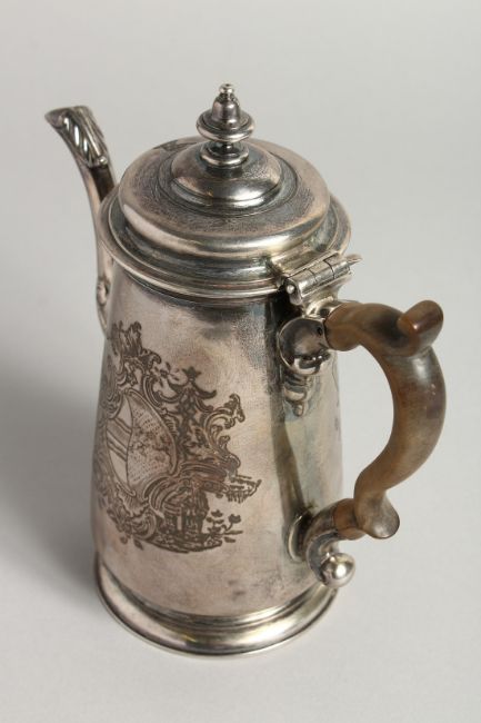 A GEORGE II COFFEE POT AND COVER with a cast spout and wooden handles.
