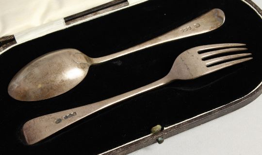 A CASED CHRISTENING FORK AND SPOON.