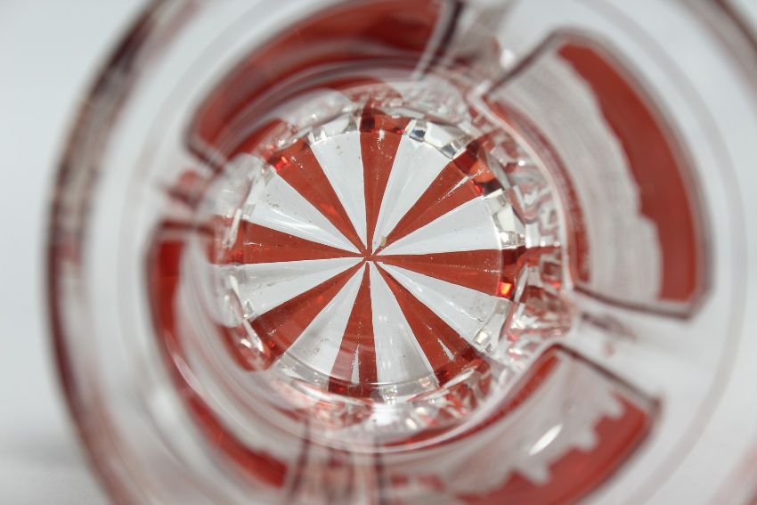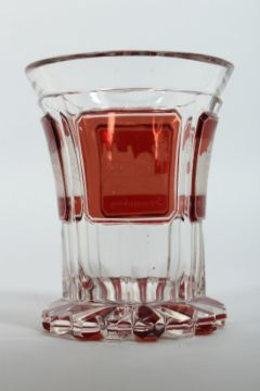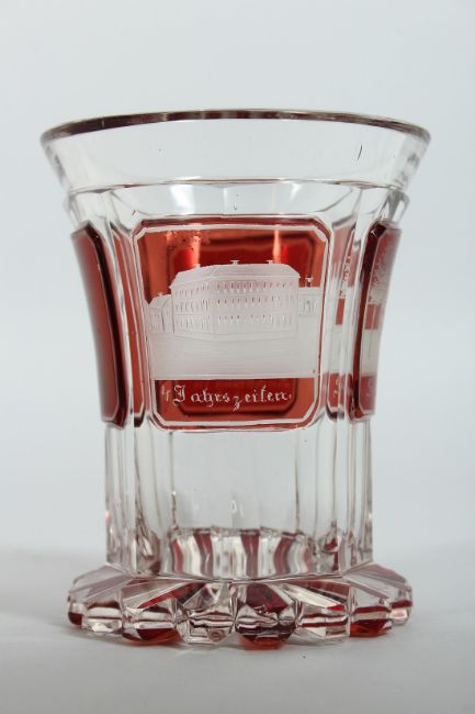 A GOOD BOHEMIAN GOBLET with engraved buildings on a ruby background.