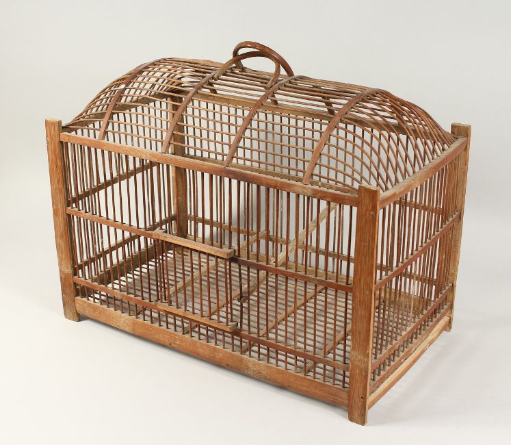 A WOODEN BIRD CAGE with carrying handle