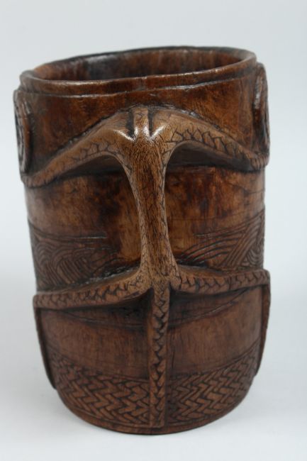 A CARVED WOOD TRIBAL MUG / VESSEL carved out of the solid.