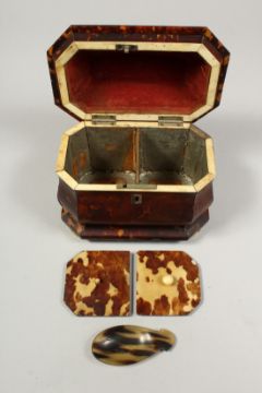 A GOOD REGENCY TORTOISESHELL TWO DIVISION TEA CADDY with crossbanded domed top.