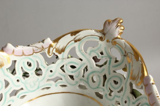 A GOOD LARGE LATE 19TH CENTURY MEISSEN COMPORT, with a floral encrusted pierced basket, supported by a naturalistic floral tree with a male and female figure, on a moulded base.