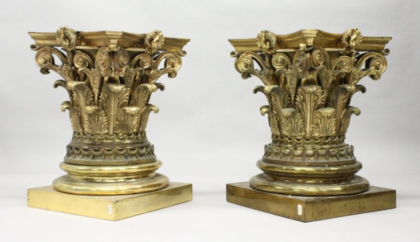 A GOOD PAIR OF LARGE CAST BRASS CORINTHIAN COLUMN CAPITALS, each standing on a square base with shallow socle supports.