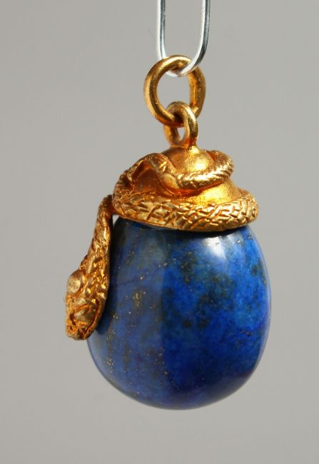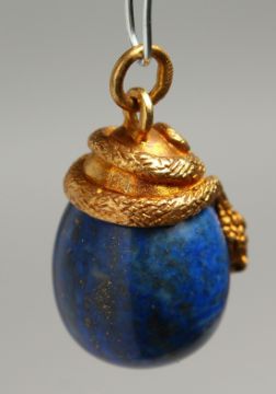 A RUSSIAN SILVER AND LAPIS EGG PENDANT with entwined snake