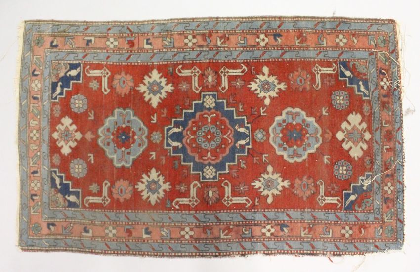 A SMALL PERSIAN RUG, red ground with geometric decoration.