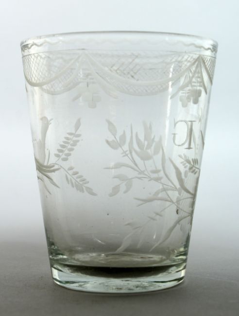 AN EARLY GLASS BEAKER engraved with birds and flowers and initial I G.