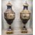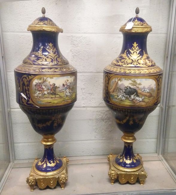 A SUPERB LARGE PAIR OF 19TH CENTURY SEVRES PORCELAIN URNS AND COVERS, rich blue ground with gilt decoration and very good quality painted panels, with ormolu mounts and bases.