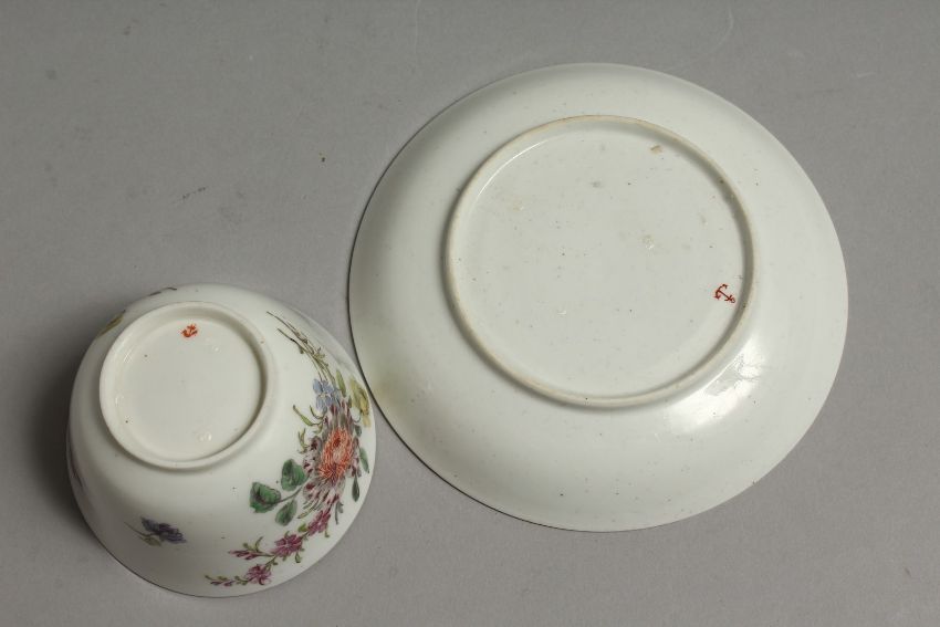 AN 18TH CENTURY CHELSEA RED ANCHOR MARKED TEA BOWL AND SAUCER painted with Meissen style flowers