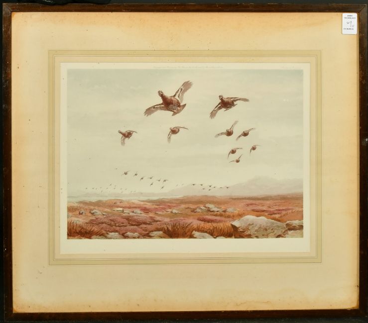 A group of three prints by J.C. Harrison, 'Autumn Glory, Pheasants', and ' A good drive, Grouse', both 11" x 14.5" and with Vicars Brothers, London trade labels verso, along with 'Snipe', 13.75" x 9.75" and with Redjn & Co, Cambridge trade label verso. (3).
