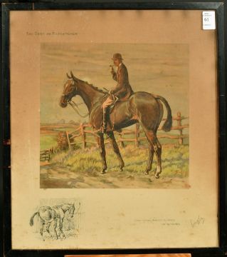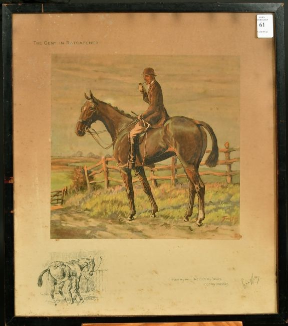 A snaffles print, The gent in Ratcatcher, 'I have my man cleaning my osses, nor my breeches', signed in pencil, 16" x 14".