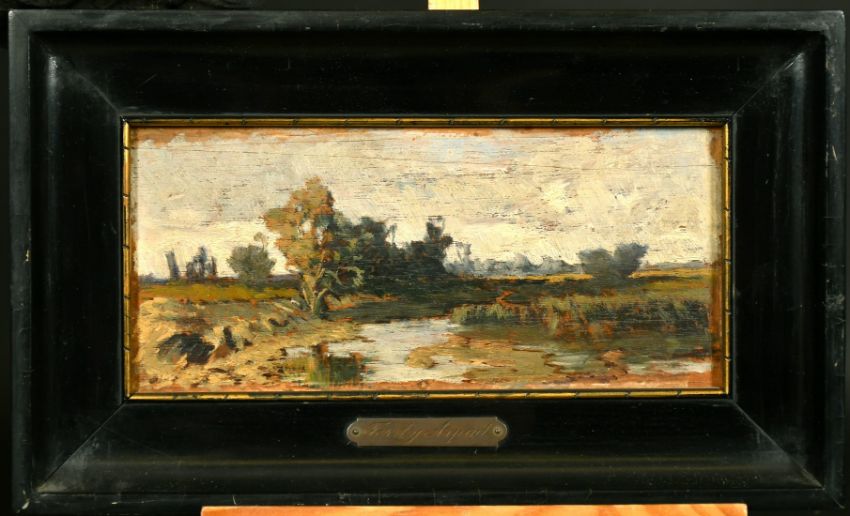 Feszty Arpad (1856-1914) Hungarian, a sketch of a river landscape, oil on board, signed verso, 4.75" x 10".