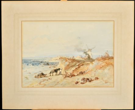 Attributed to Robert Brandard (19th Century) 'Bognor Rocks', A horse and cart pulling rocks off a beach with a windmill on the dunes beyond, inscription verso, 8.25" x 11.5". (unframed).