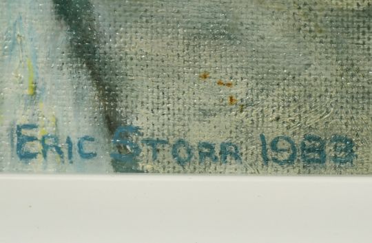 Eric Storr (21st Century) A burgundy steam train under a rising moon, oil on canvas, signed and dated 1983, 18" x 26".