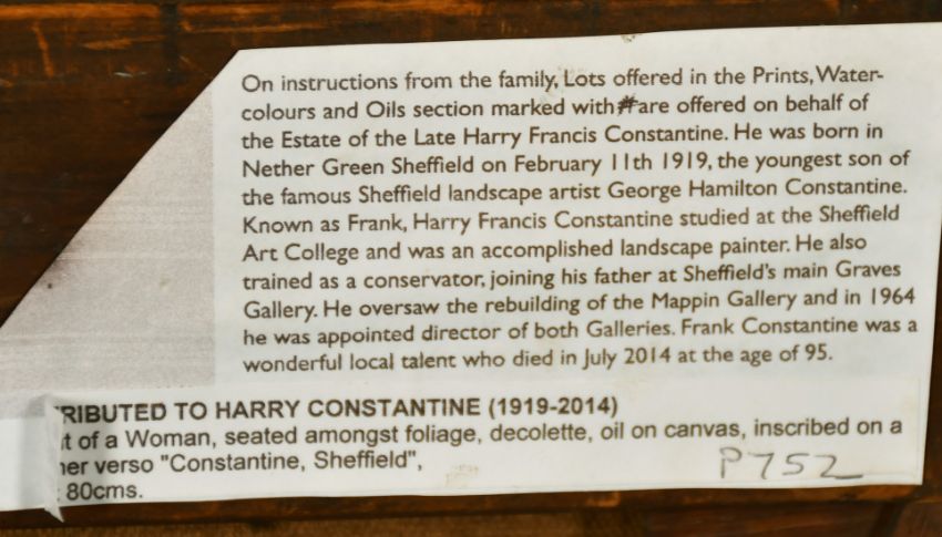 Early 20th Century English School, a scene of a female warrior putting in armour, oil on canvas, various inscriptions verso, 36" x 31.5".
