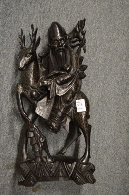 A Chinese carved wood and silver wire inlaid model of a priest on a deer.