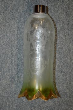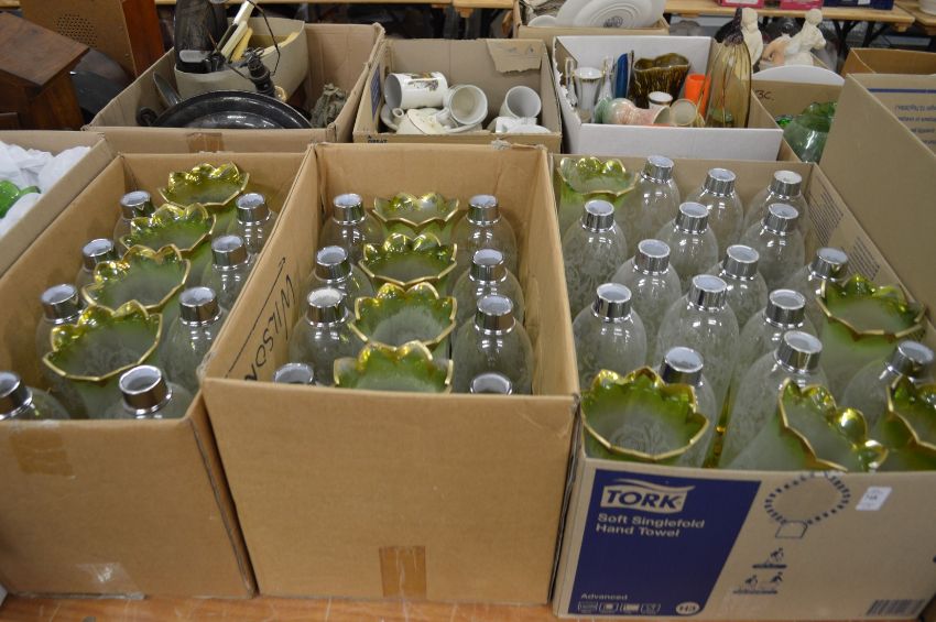 A large quantity of etched glass and green tinted lampshades.