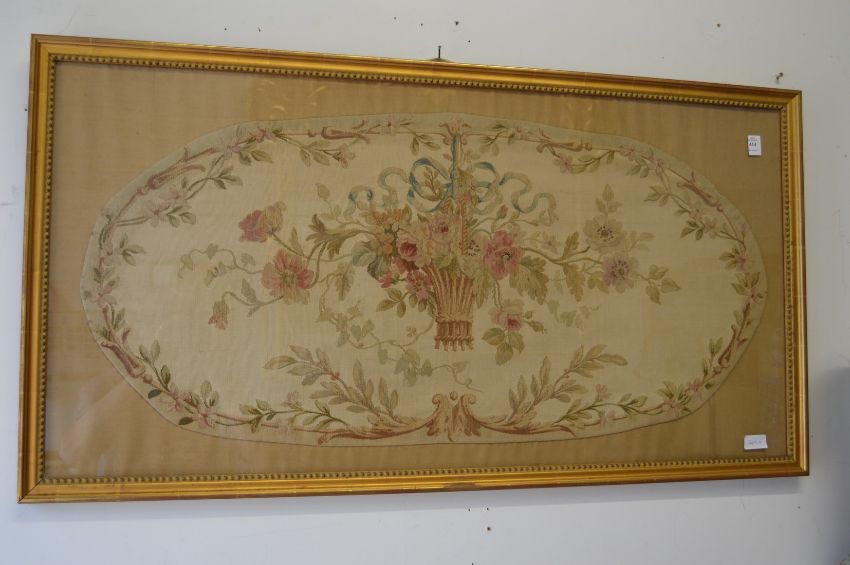 An Aubusson style tapestry picture of a basket of flowers, decoratively gilt framed and glazed.