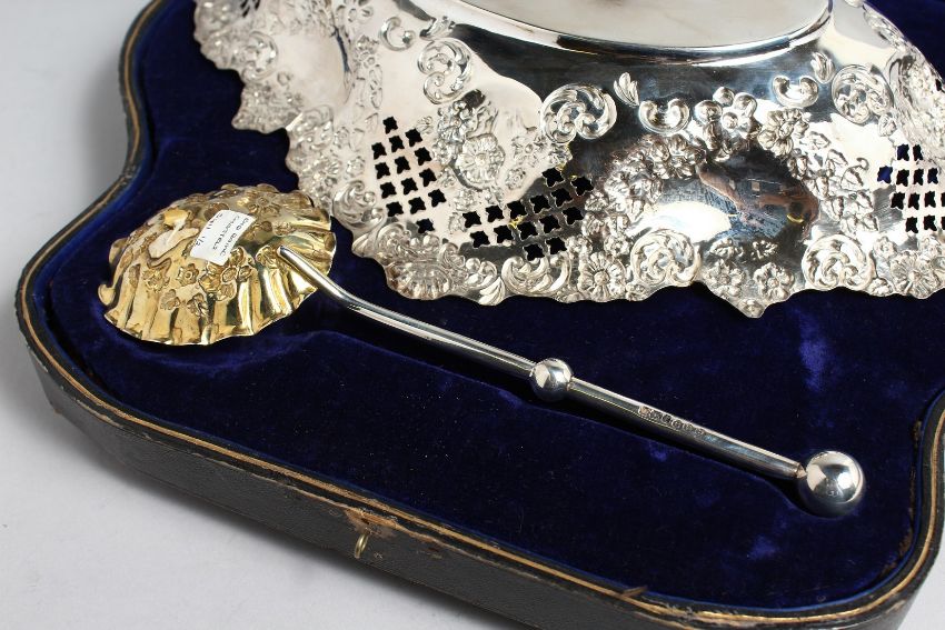 A VICTORIAN PIERCED AND EMBOSSED STRAWBERRY DISH AND SPOON in a fitted case, Sheffield 1899, with inscription; To Major J Osbourne, From The Civil Surgeons of No.6 General Hospital, Naawfoort & Johannesburg.