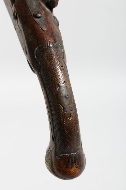 A 19TH CENTURY FLINTLOCK PISTOL for the Eastern market, with inlaid barrel, engraved lock plate and brass butt cap to the grip.