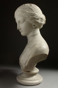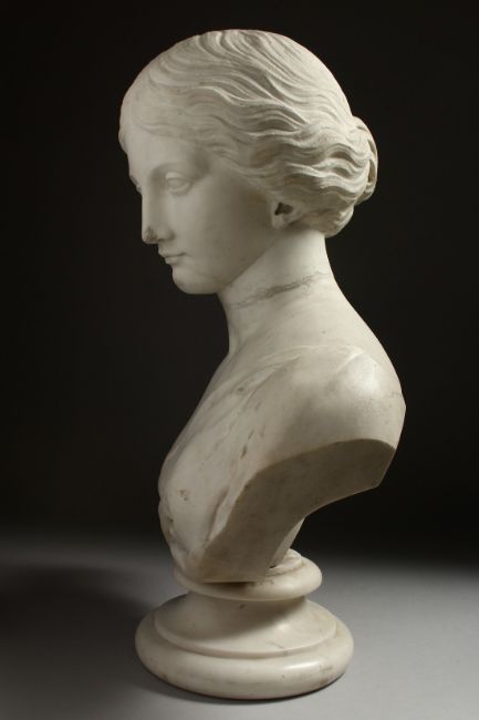 A VICTORIAN CARVED WHITE MARBLE BUST OF A YOUNG LADY.