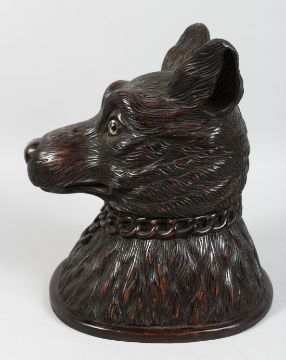 A LARGE BLACK FOREST CARVED WOOD DOG'S HEAD TABLE TOBACCO BOX with glass eyes.