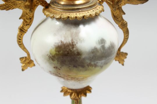 A CONTINENTAL ORMOLU, PORCELAIN AND ENAMEL TWIN HANDLED VASE, with phoenix handles, the body painted with a landscape and seated musician.