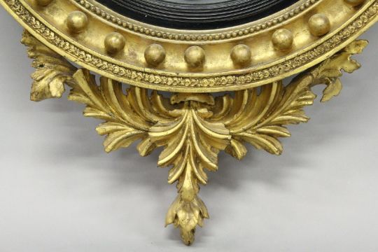 A REGENCY GILT WOOD CONVEX MIRROR with eagle cresting, ball applied frame and curved decoration to the base of the frame.